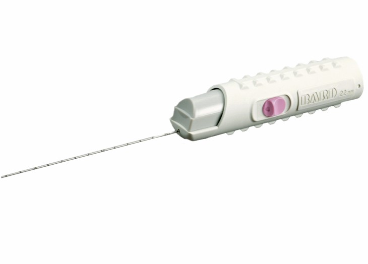 Instrumento automático para Biopsia Core reutilizable; Gran potencia y contundencia en el disparo garantizando muestras de alta calidad y la posibilidad de manejo con una sola mano.