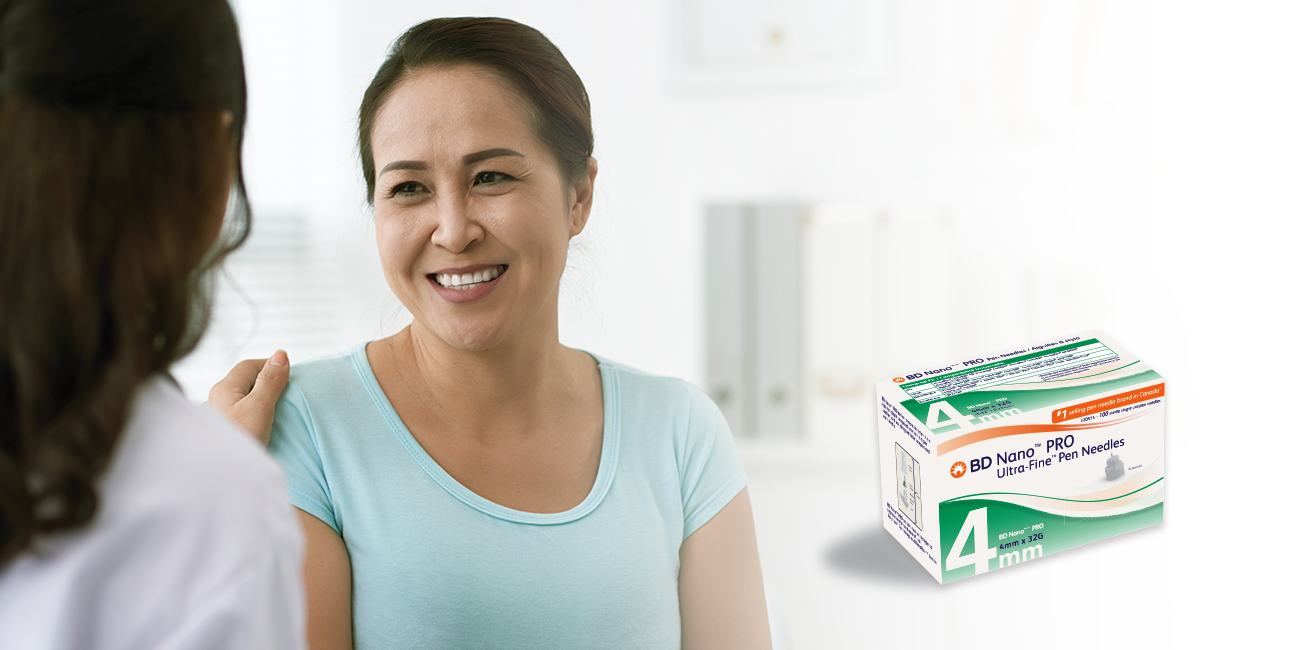 The redesigned shape of the BD Nano PRO needle base helps ensure you inject insulin into the fat layer below the skin—reducing your risk of injecting into muscle by up to 85% compared to other 4 mm pen needles.*